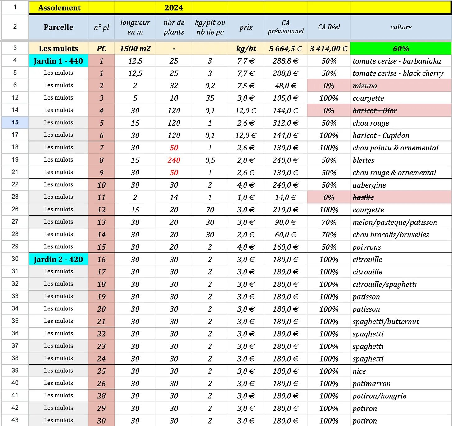 Cette parcelle de 1500 m2 m’a permis de générer un chiffre d’affaires de 3400 € sur un prévisionnel de 5660 €, soit la réalisation de l’objectif théorique à 60%. C’est plutôt un bon résultat mais ça reste loin des prévisions (et surtout sans les charges…). On parle souvent, et théoriquement, d’une perte de 40% de la production entre la plantation et la commercialisation, on dirait bien que la théorie et la pratique se confirment !