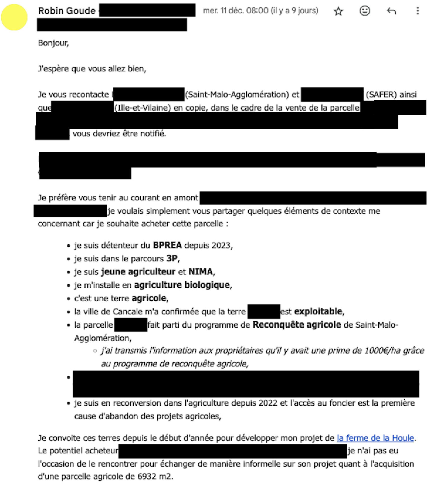 Je contacte aussi quelques relations à droite et à gauche : le voisinage, un clerc de notaire, des associations Cancalaises, des syndicats, des agriculteurs pour avoir un maximum d’informations - tout simplement parce que nous sommes dans une région où le foncier est un sujet sensible.