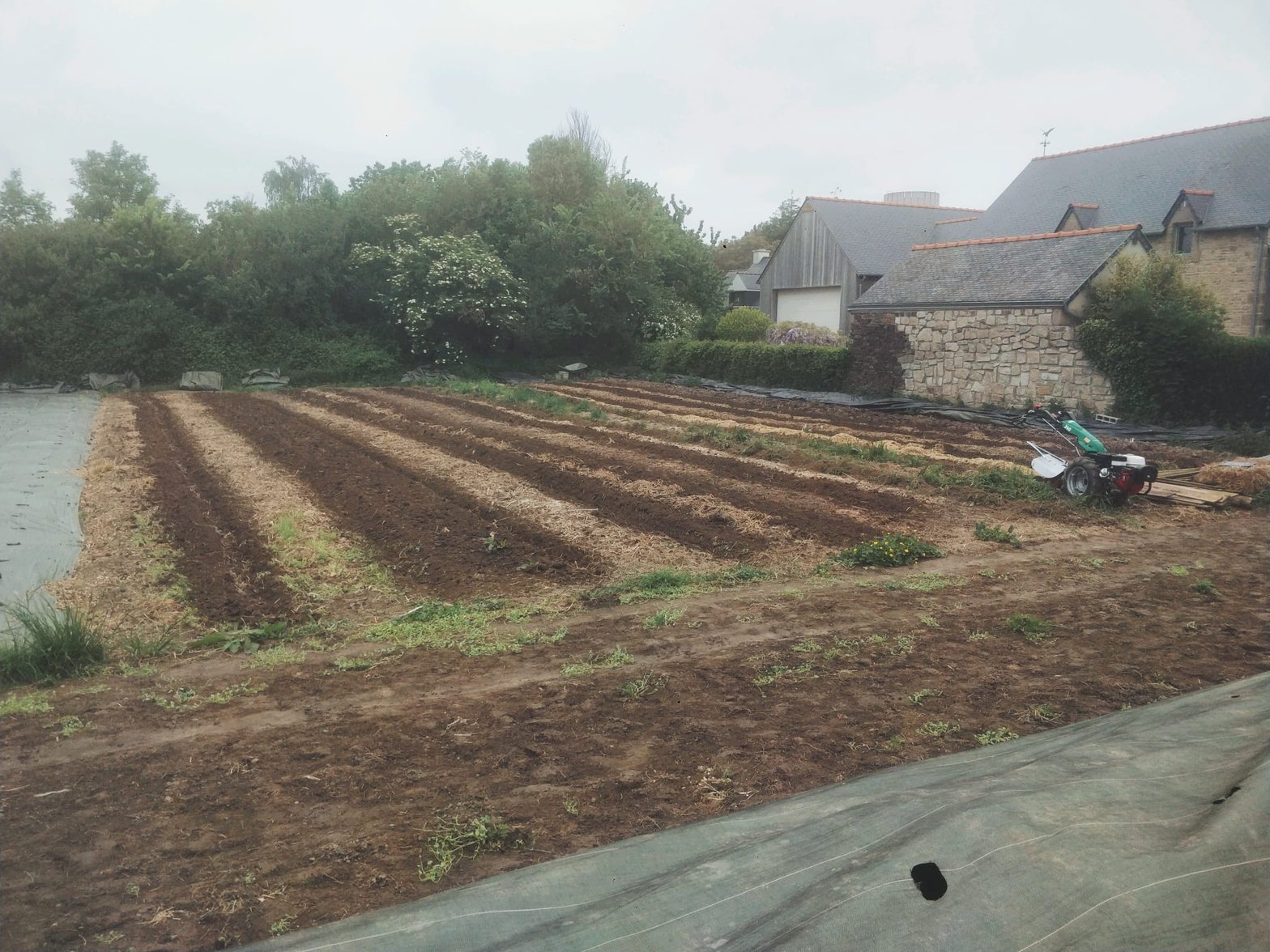 Avant tout, j’ai le plaisir de vous présenter ma Ferrari, un motoculteur qui m’a été prêtée par l’association Ici Cultivons Demain. Alors, sur chacune de mes planches j’ai réalisé des combinaisons différentes : avec ou sans travail du sol, avec ou sans amendements, avec ou sans engrais vert. Je vais avoir du mal à en sortir une conclusion scientifique claire mais ce qui est sûr c’est qu’on peut observer des différences. Pour autant, quand on est sur le terrain, il faut avancer et faire des choix rapidement. En gros, je n’ai pas le temps de vous faire une thèse.. quoique… non, non je plaisante.